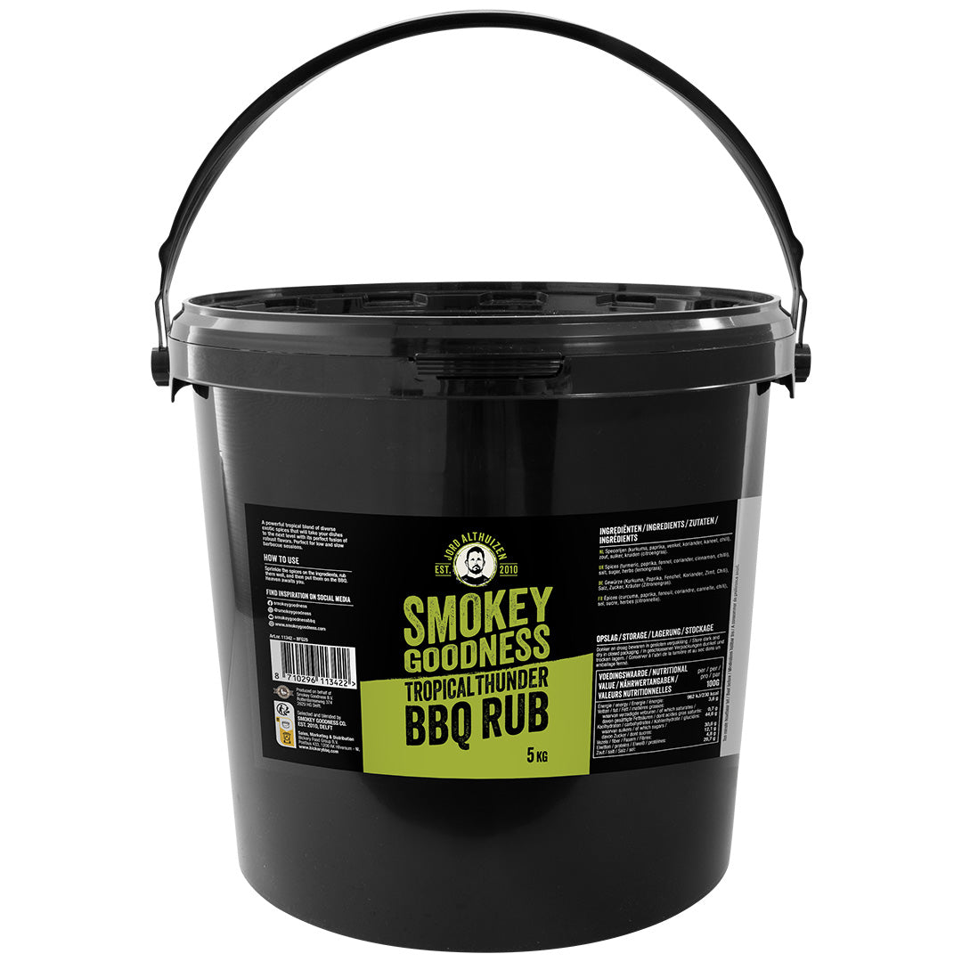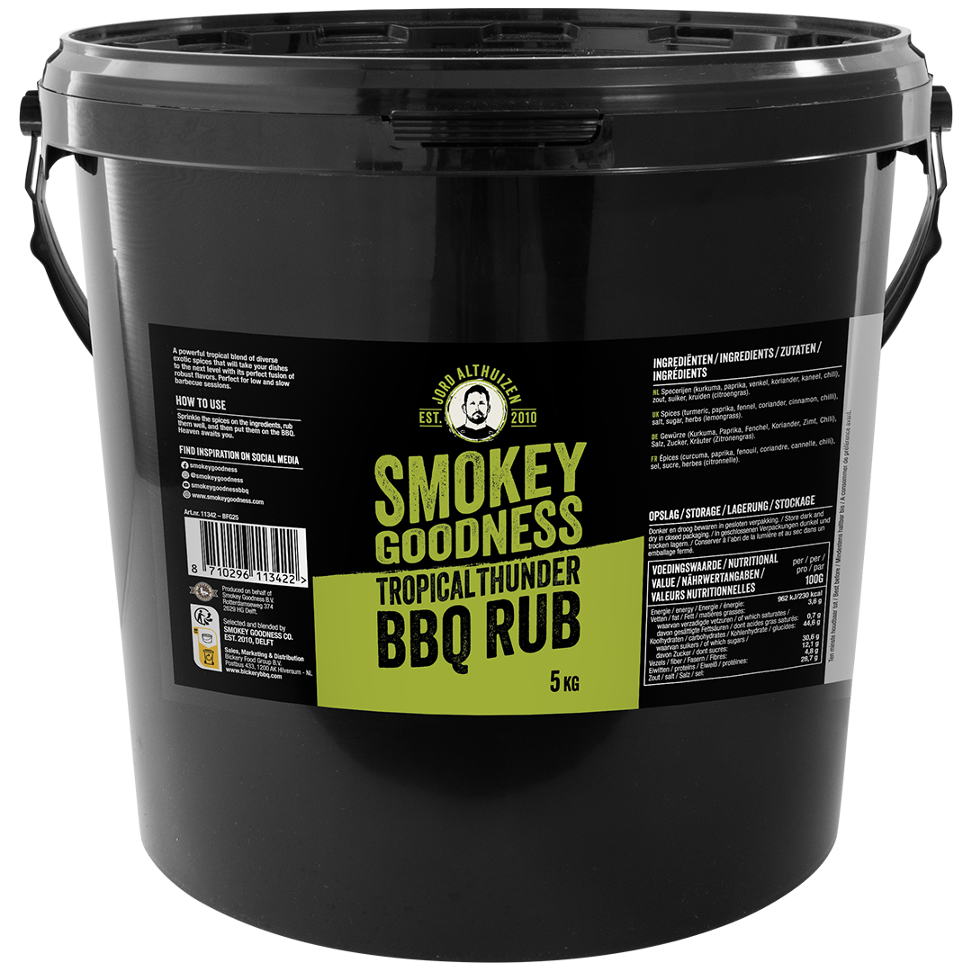 Een krachtige tropische mix van diverse exotische specerijen die met zijn perfecte fusie van robuuste smaken je gerechten naar een hoger niveau tillen. Perfect voor langzame barbecuesessies.